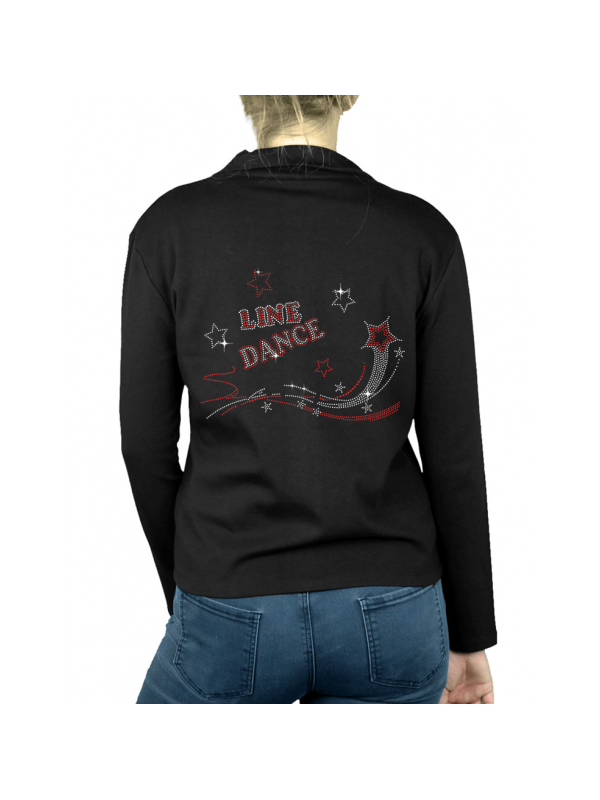 Ce petit gilet fin sans capuche avec son motif en strass line dance dans le dos ne vous quittera plus ! C'est un modèle unique de gilets country avec son inscription line dance en paillette sur le devant.