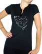 T-shirt femme encolure arrondie et col mandarin, 95% coton peigné, 5% élasthane (200gr/m2)Le motif représente une tête de cheval ébouriffé en argent et doré. Deux couleurs possibles pour ce modèle de tee-shirt : noir et blanc. Taille disponible: S au XL .
