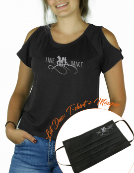 In StockPackaging Batwing tee shirt + matching maskUNS2 certified three-ply fabric mask to match the t-shirt. Country dancer printed in white and light brown.