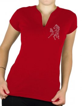 DisponibleT-shirt femme col en pointe, 100% coton peigné (200gr/m2).Motif représentant deux Hirondelles entre les deux une rose en strass et clous.Trois couleurs possibles pour ce modèle de tee-shirt : noir, blanc et rouge.La taille 3XL (ou T6 ) est disponible en noir uniquement.