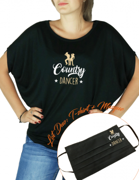 DisponiblePackaging tee shirt "épaule cut " + masque assortis Masque tissu trois plis certifié UNS2 assorti au tee shirt. Impression en gris argent sur le thème de la line dance.