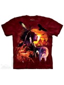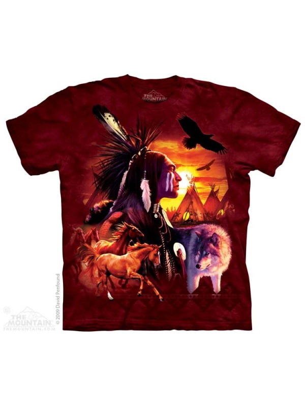 Tee-shirt américain, impression d'un motif indien coiffé et animaux sauvages devant sur fond tie-dye ou marbré.