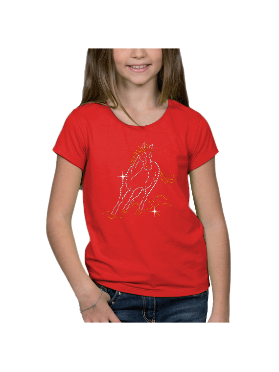Tee-shirt fillette moulant col rond. Cheval en stras et clous imprimé sur le devant du t-shirt.